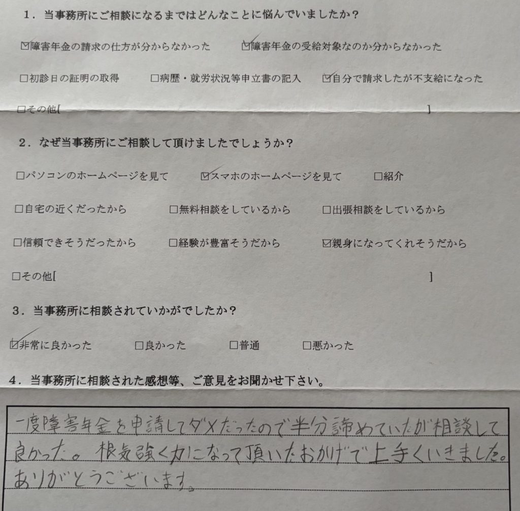 一度障害年金を申請してダメだったので半分諦めていたが相談して良かった。根気強く力になって頂いたおかげで上手くいきました。